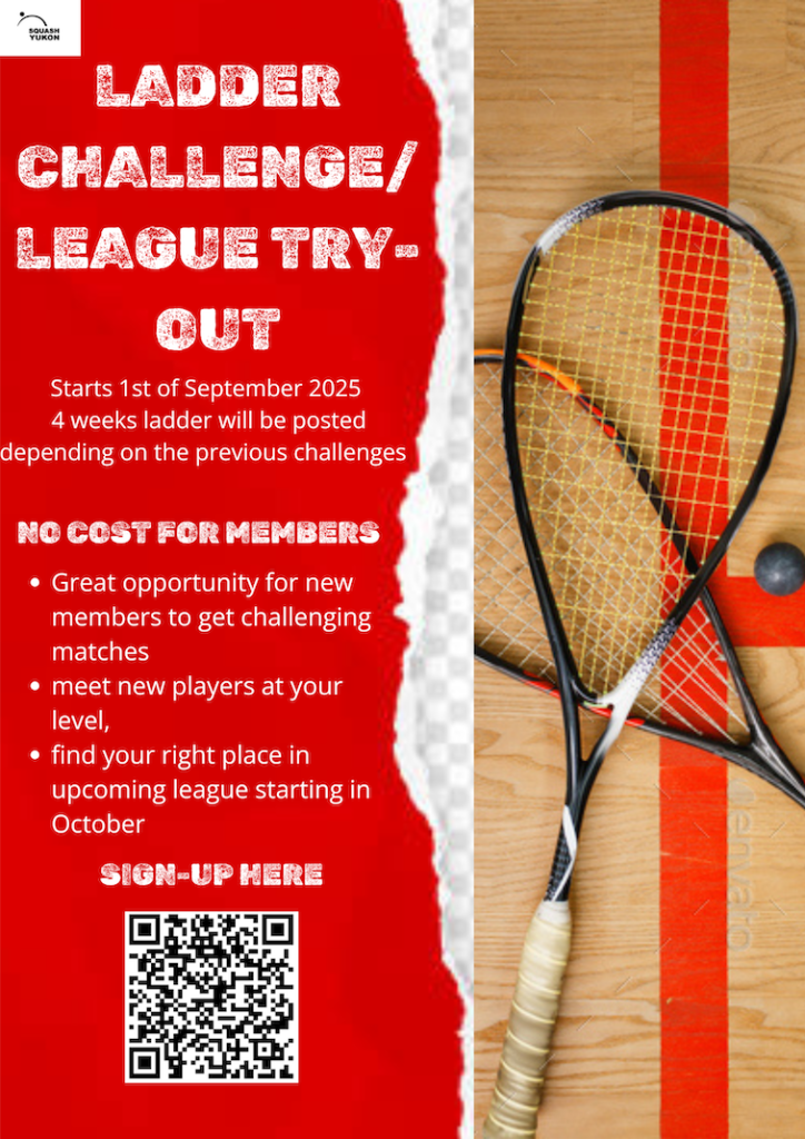 Squash Yukon is offering members a month of free ladder challenge/Leaguetryout starting September 1st, 2025.